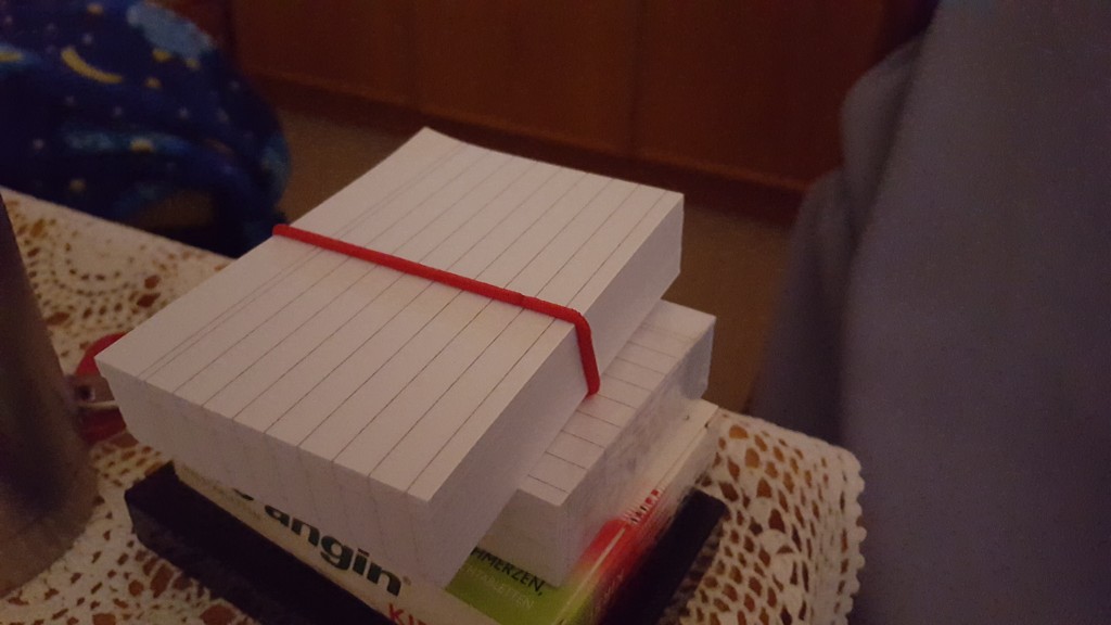 Um den Rest an schlechtem Gewissen zu beruhigen, war ich einkaufen. Jetzt stehen 200 Karteikarten neben mir, die ich „nur“ noch beschriften und lernen muss.
