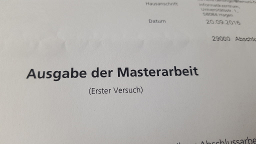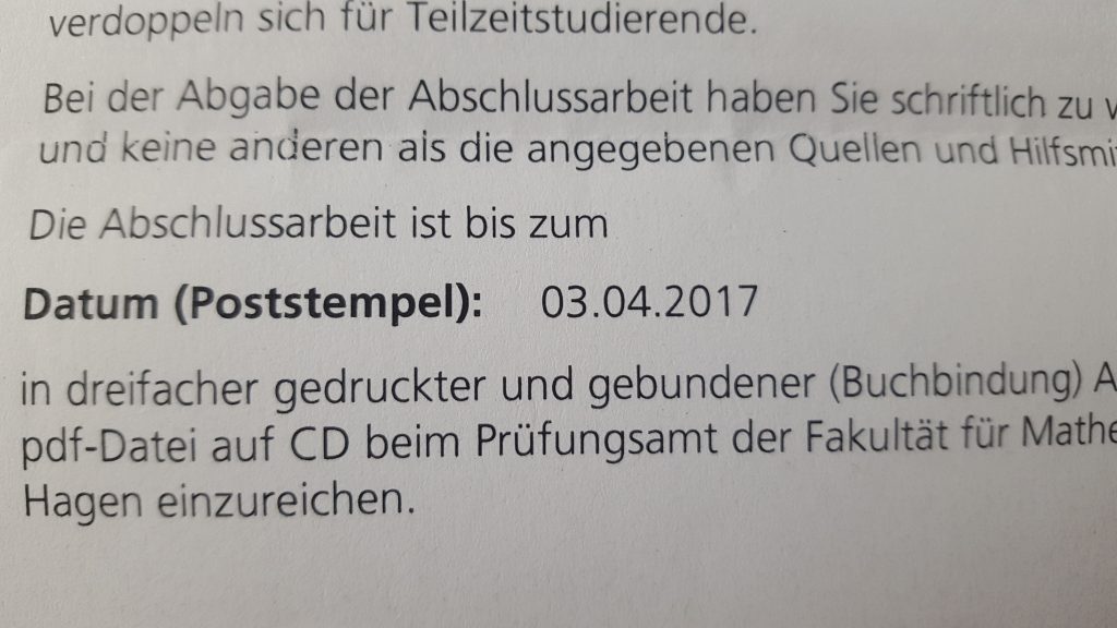 Und Beginn- und Abgabedatum sind jetzt nicht mehr nur Gegenstand meiner Studienplanung, sondern hart dokumentierte Meilensteine, seit ich das Schreiben der Fernuni zur Ausgabe der Masterarbeit erhalten habe.