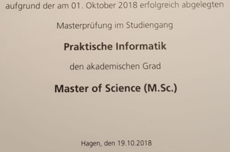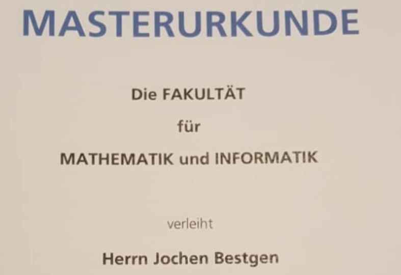 Beeindruckt hat mich das Tempo, mit dem Prof. Haake und Dr. Veiel als Zweitkorrektor das Gutachten fertiggestellt haben. Und auch das Prüfungsamt war unglaublich schnell. Von der Abgabe bis zu dem Zeitpunkt, als ich den Brief mit Masterurkunde, Prüfungszeugnis und Diploma Supplements in den Händen halten konnte, vergingen nur etwas mehr als drei Wochen. In einigen Diskussionsforen berichteten Kommilitionen von ihren Erfahrungen, und da sah es nicht ganz so rosig aus. Im übrigen hat es bei meinem Studium in Paderborn vor knapp 18 Jahren auch gut 10 Monate gedauert, bis ich mein Diplom im Prüfungssekretariat abholen konnte.