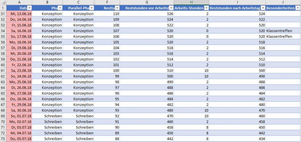 –> Noch zur Verfügung stehende Arbeitsstunden (nicht jeder Tag hatte die gleiche Anzahl an Arbeitsstunden)