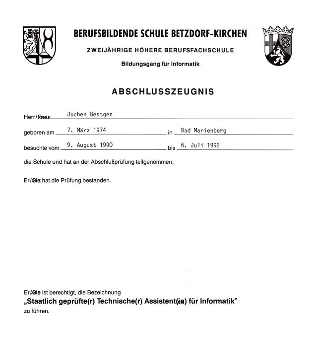 Egal, nach 2 Jahren Schule konnte ich dann im Juli 1992 die Ausbildung erfolgreich abschließen und durfte mich seither als „Staatlich geprüfter Technischer Assistent für Informatik“ bezeichnen.