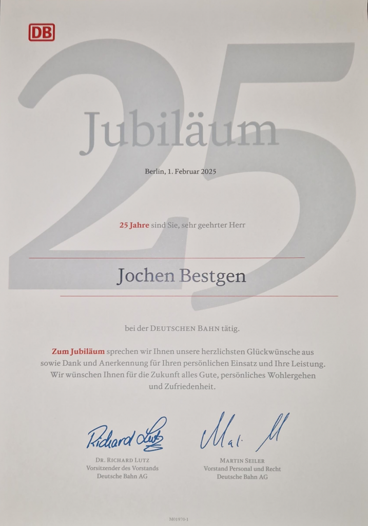Eigentlich sollte die erste Arbeitsstelle nur dazu genutzt werden, um das auf der Uni erworbene theoretische Wissen um praktische Aspekte zu erweitern. Danach wollten Thorsten, Carsten und ich ein Startup gründen. 3 Jahre hatten wir uns damals dafür Zeit gegeben. Die Startup-Pläne entstanden auf dem Scheitelpunkt des Dotcom-Booms, als das Internet (oder vielmehr: das Worldwide Web) tatsächlich noch relatives Neuland war und Venturekapital im Überfluss verfügbar zu sein schien. Im März 2000 begann diese Blase zu platzen, und mit ihm löste sich unser Plan in Luft auf. Jeder von uns blieb also bei seinem Arbeitgeber, und aus den ursprünglich geplanten 3 Jahren bei der Deutschen Bahn wurden heute schließlich satte 25. Silbernes Jubiläum. Vom Konzernvorstand gab es zu diesem Anlass eine schicke Urkunde und einen DB-Pin aus ebendiesem Material.